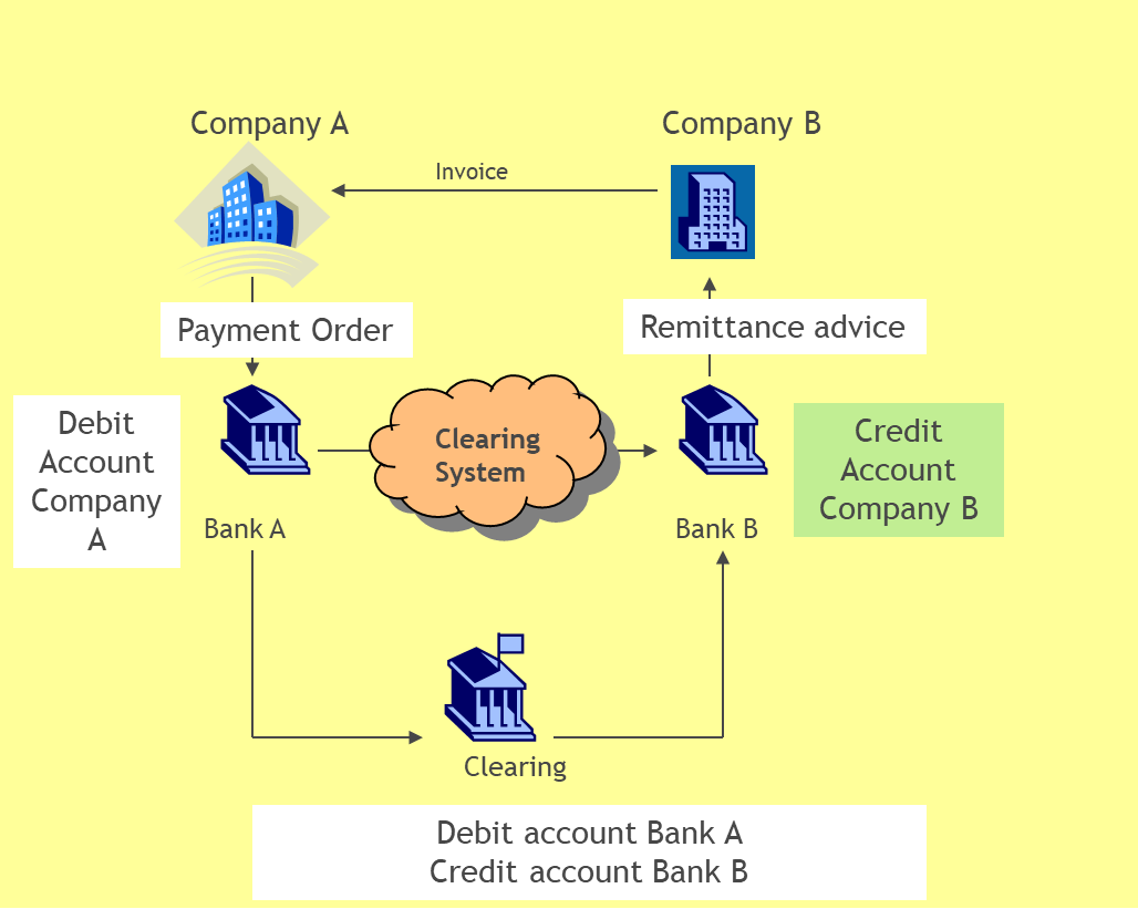 If A needs to pay money to B, then he will send a payment order to his bank (ordering bank), who will in turn debits the account of company A and sends the payment order to bank of the beneficiary (B’s Bank) through the clearing, asking to B’s bank to credit the beneficiary’s account.