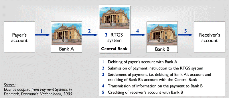 Examples: Fedwire in the USA, CHATS in Hong Kong, TARGET in Europe, CHAPS in the UK, DEBES in Denmark, RIX in Sweden and SIX in Switzerland